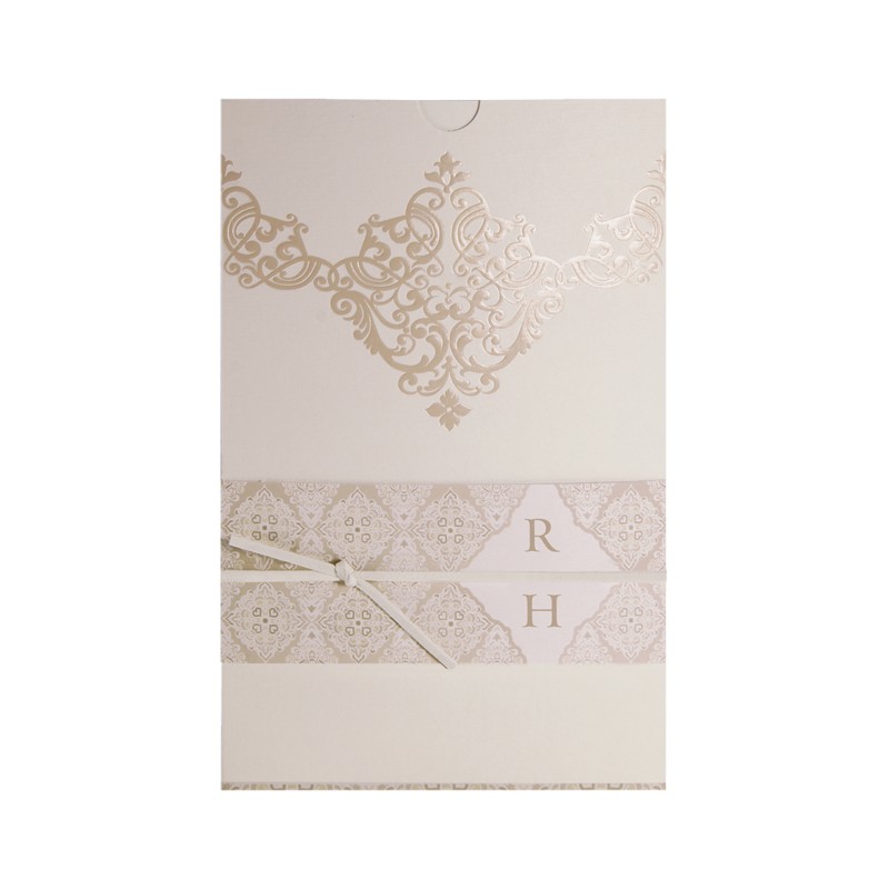 Hochzeits-Einladungskarte aus hochwertigem, weißem Aquarell-Karton mit Farbdruck und Prägung im orientalischen Stil.