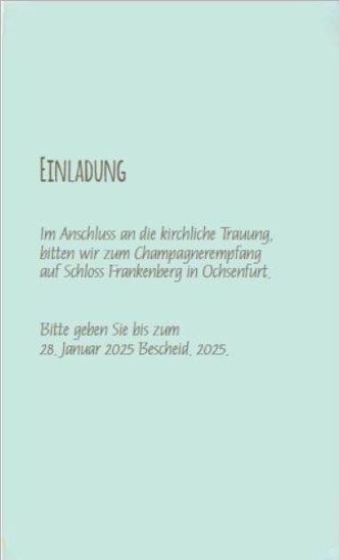 | Lieferumfang: | Einladungskarte mit Schlitzöffnung, zwei Einsteckkarten, optional Briefumschlag |