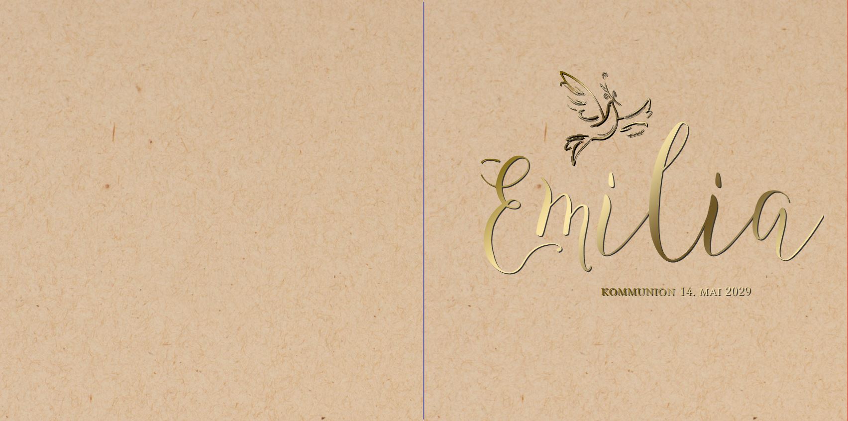Naturbraune Kommunions-Einladungskarte mit goldener Taube und Namenprägung in gold als praktische Klappkarte