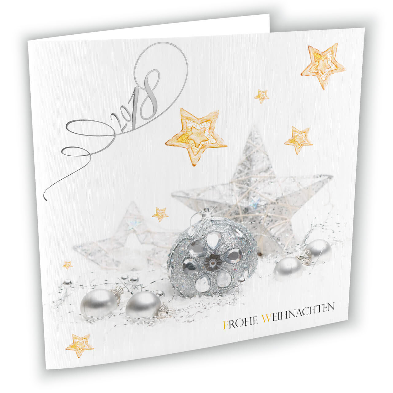 Weihnachtskarte aus hochwertigem weißem Leinen-Karton mit Motivdruck "Silberdeko" und Folienprägung 2018.