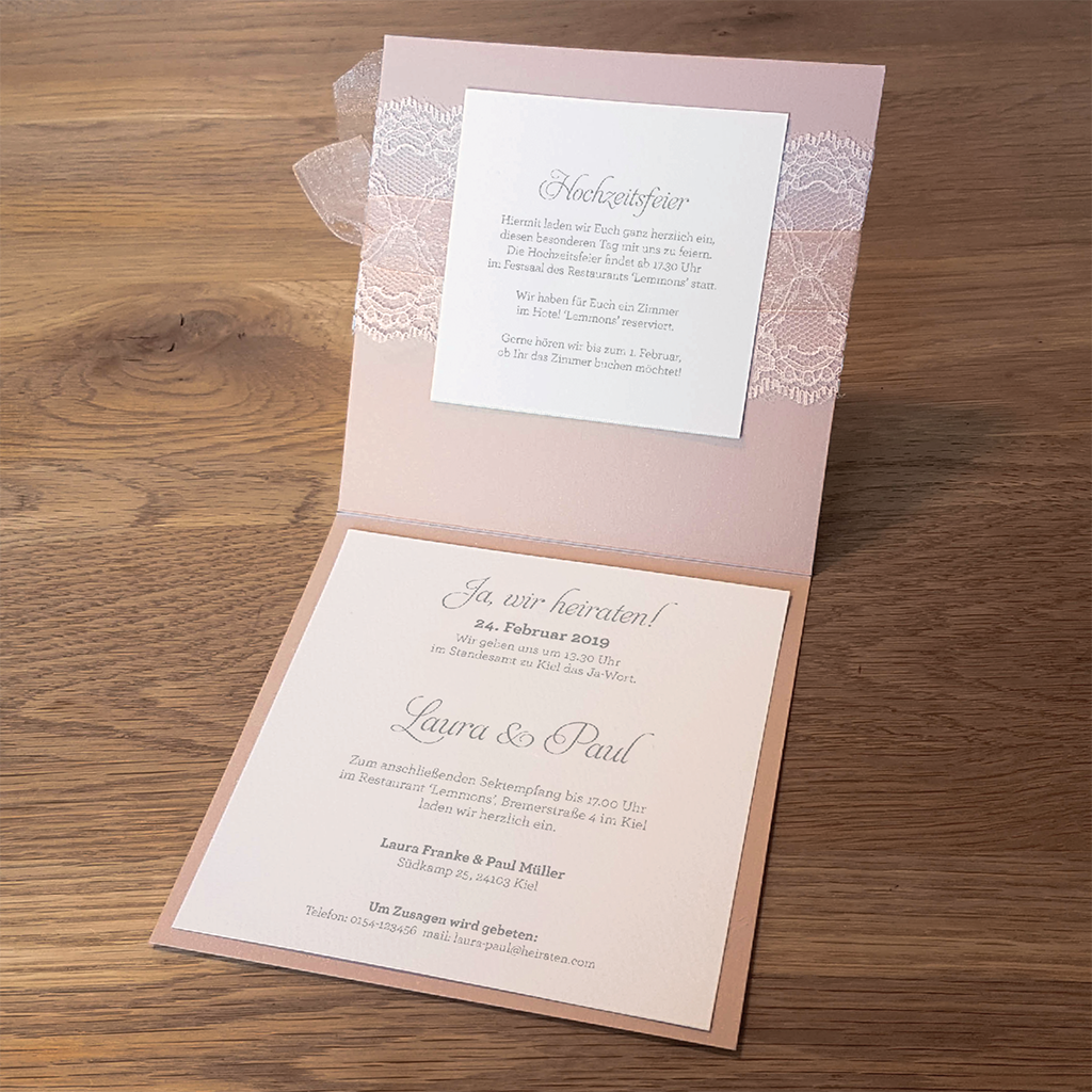Romantische Einladungskarte in altrose mit weißem Spitzenband und lachsrosa Organzaband