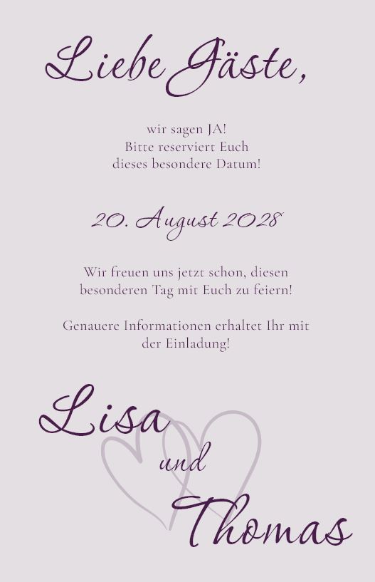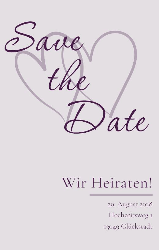 Romantische Save the Date in flieder mit zwei Herzen als beidseitig bedruckbare Einzelkarte