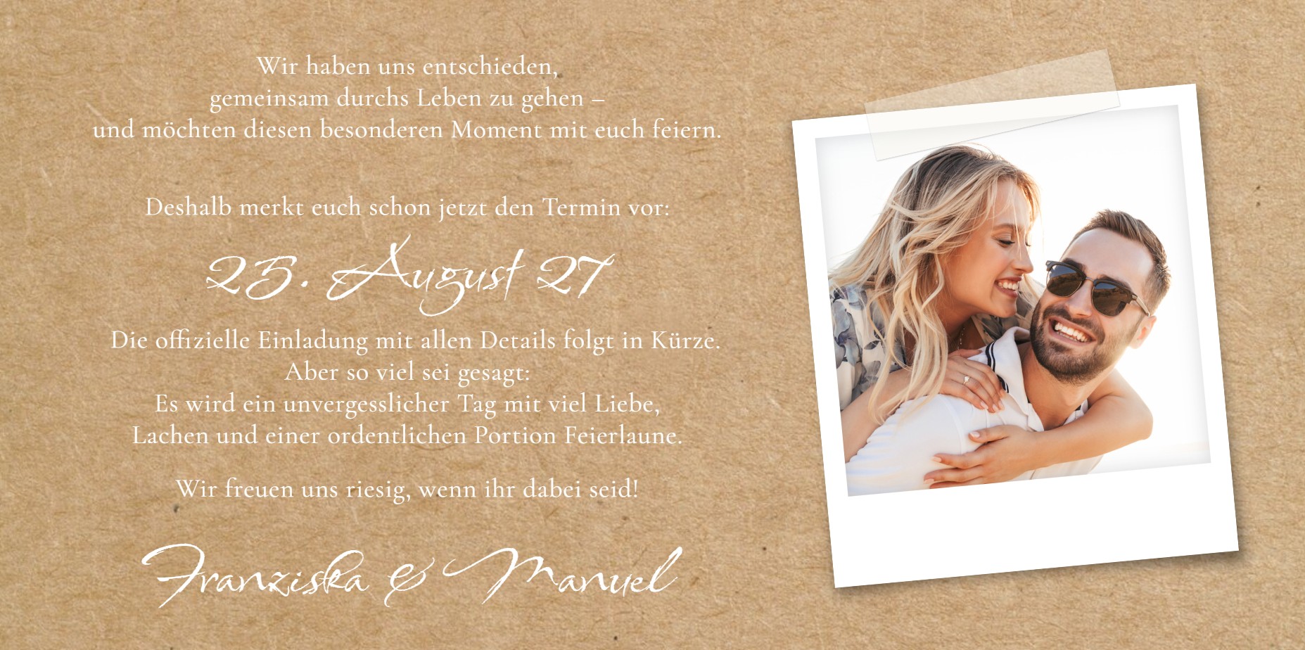 In unserem Beispiel wurde das Hochzeitsdatum und der Schriftzug "Save the Date" in weiß in den Kraftkarton-Hintergrund effektvoll eingedruckt.