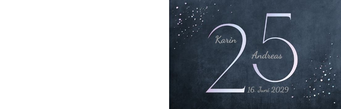 Die Zahl "25" ist in holografisch-silber auf die Vorderseite geprägt. Die Namen, das Jubiläumsdatum und kleine Pünktchen sind ebenfalls in silber gedruckt.