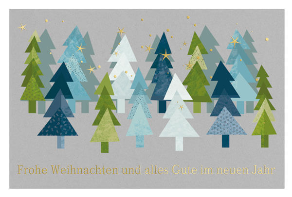 Originelle Weihnachtsbäumchen sind in unterschiedlichen Farben und Formen auf der Klappkarte zu sehen.