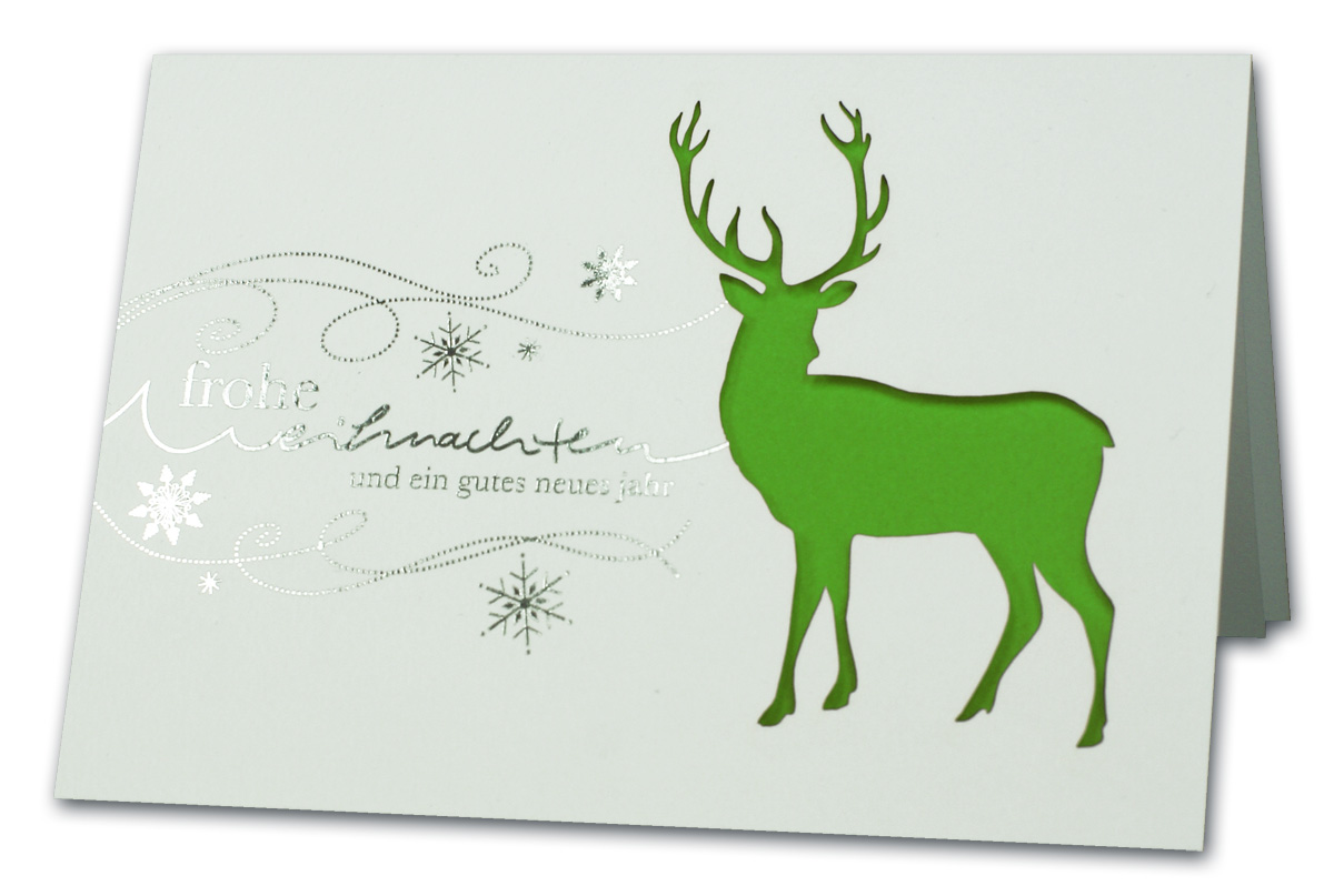 Weihnachtskarte aus hochwertigem, weißen Naturkarton mit edler Silberfolienprägung "Frohe Weihnachten und ein gutes neues Jahr" sowie Ausstanzung eines Hirsches. Silberne Sterne verzieren diese Karte zusätzlich. Bei dieser Stanzkarte können Sie aus verschiedenen farbigen Einlegeblättern auswählen.