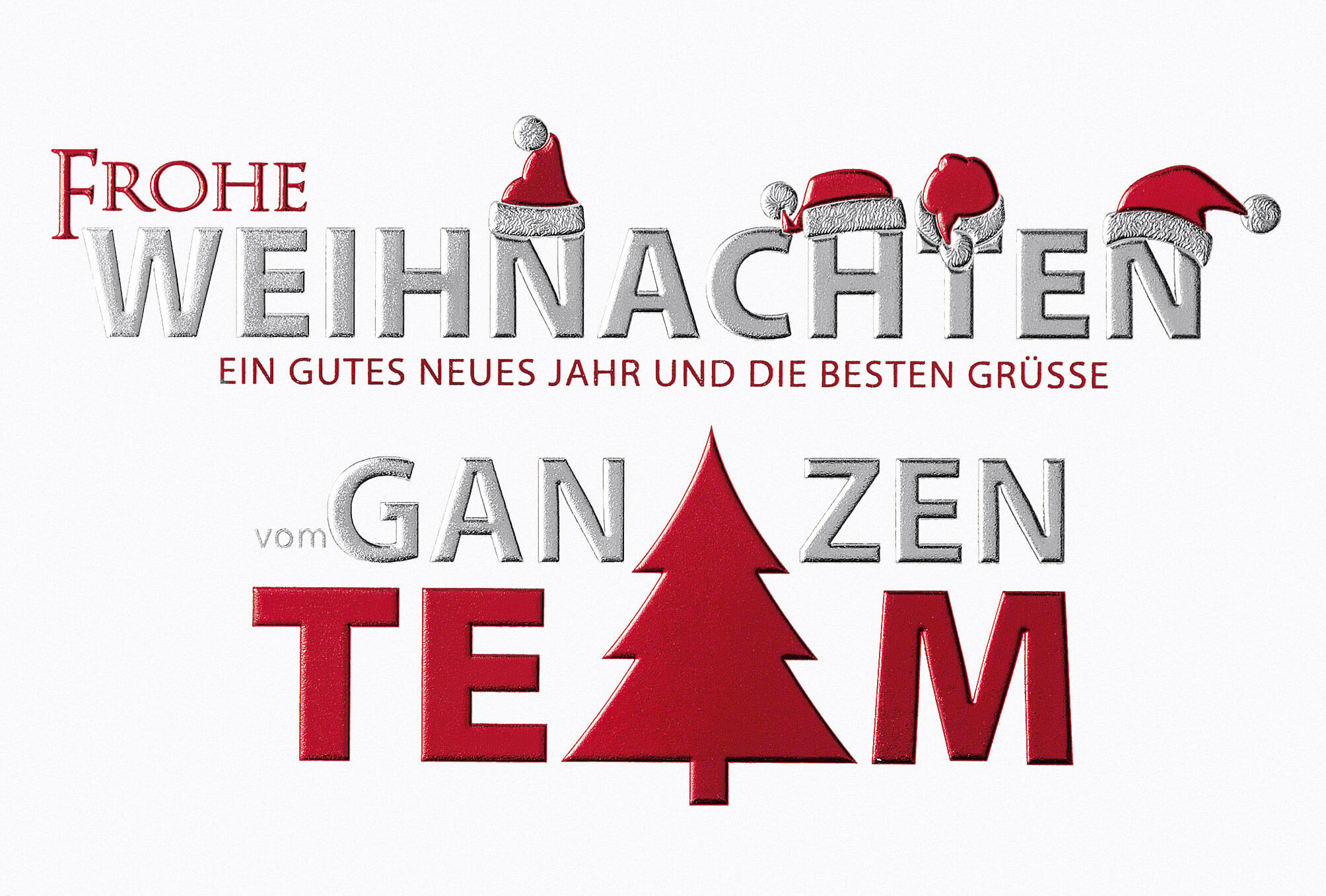 Weihnachtskarte aus hochwertigem weißem Bilderdruck-Karton mit Farbdruck, Roter Folienprägung und Holographiefolie. Auf der Karte steht Frohe Weihnachten und ein gutes neues Jahr und die besten Grüße vom ganzen Team. Ein Einlegeblatt wird mitgeliefert.