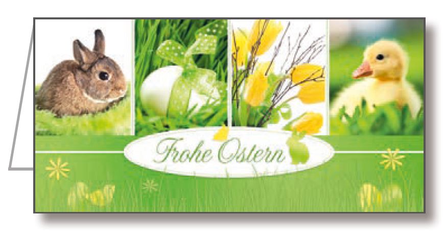 Der Gruß "Frohe Ostern" ist grün in ein ovales weißes Fenster gedruckt.