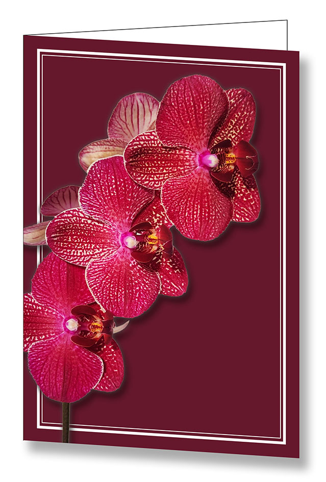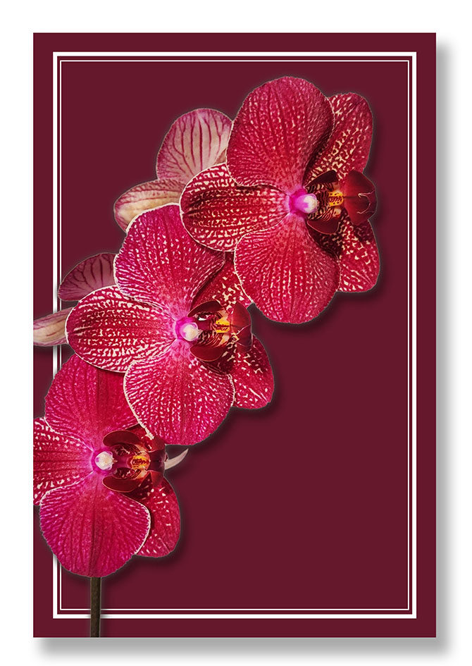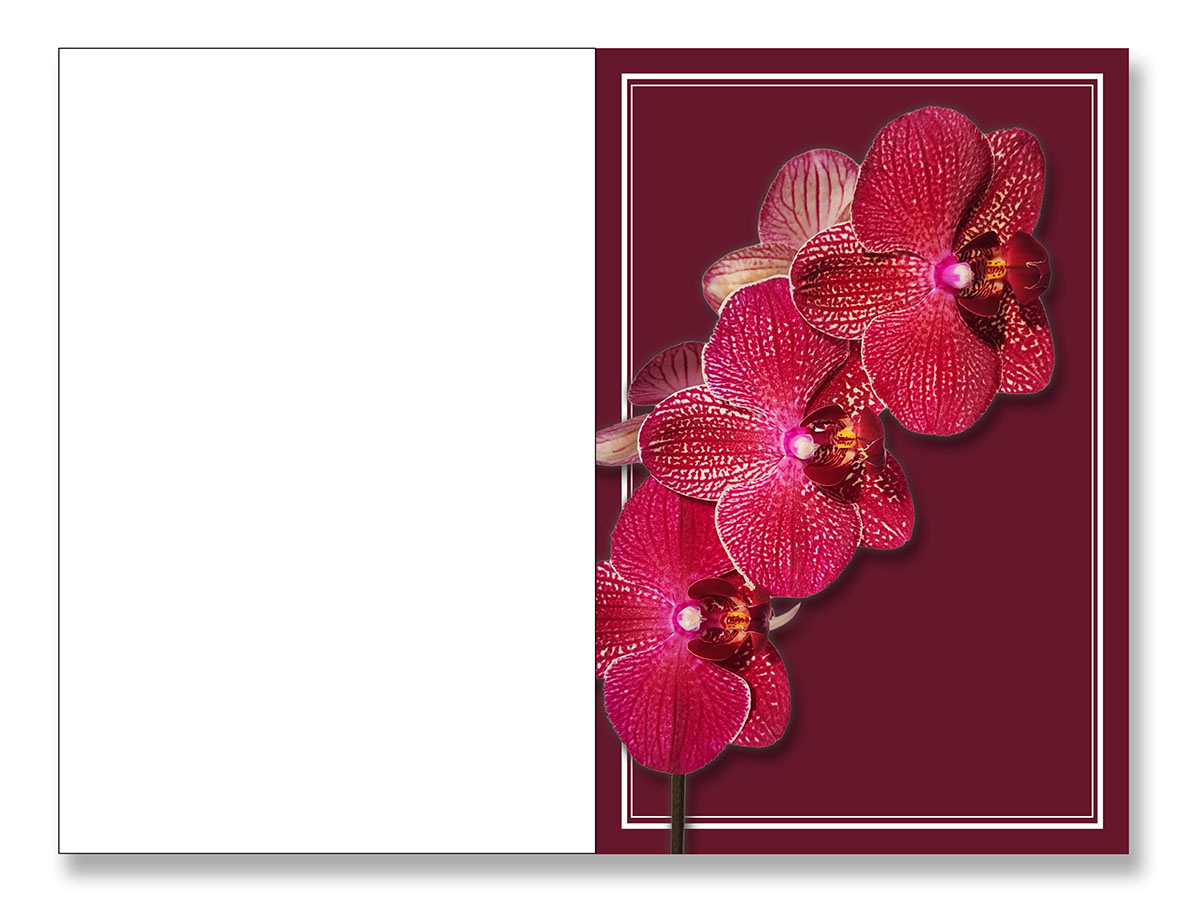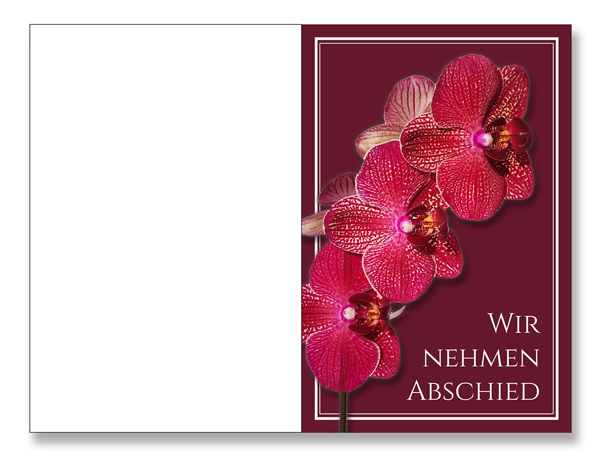 Erinnerungsbildchen / Trauer-Abschiedkärtchen mit Orchideenblüte, mit oder ohne Spruch "Wir nehmen Abschied". Kleine Trauer-Erinnerungskärtchen aus hochwertigem, weißem 170g Bilderdruckpapier, mit individuellem Foto und Texteindruck.Wenn gewünscht, können Sie über die Option "Jetzt selbst gestalten" den Text "Wir nehmen Abschied" auf der Vorderseite ändern und einen Spruch auf der Rückseite einfügen, welcher einen persönlichen Bezug zum Verstorbenen hat. Innen ist die Klappkarte komplett blanko / weiß und kann auf der linken und rechten Seite mit einem Foto des Verstorbenen, dem Geburtsdatum und Sterbedatum sowie weiterem Text personalisiert werden. Die Erinnerungsbilder können Sie bei der Trauerfeier verteilen oder auf der Kaffeetafel auslegen.Oftmals versendet man die Trauerbilder auch mit den Danksagungskarten, als Dank für die Beileidsbezeugung. Wenn Sie die Trauerbilder ohne Innendruck bestellen, und selbst bedrucken möchten, können wir Ihnen die Erinnerungsbildchen zu vier Nutzen im DIN A4 Druckbogen, zu 2 Nutzen im DIN A5 Druckbogen oder als Einzelnutzen im Endformat liefern. Bitte teilen Sie uns bei der Bestellung mit, wie Sie die Erinnerungsbilder nicht als Einzelnutzen erhalten möchten. Die Trauerbildchen werden ohne Briefumschlag geliefert. Klappkarte / Doppelkarte im Format: 7,0 x 10,5 cm Breite x Höhe (14 x 10,5 cm aufgeklappt Breite x Höhe).