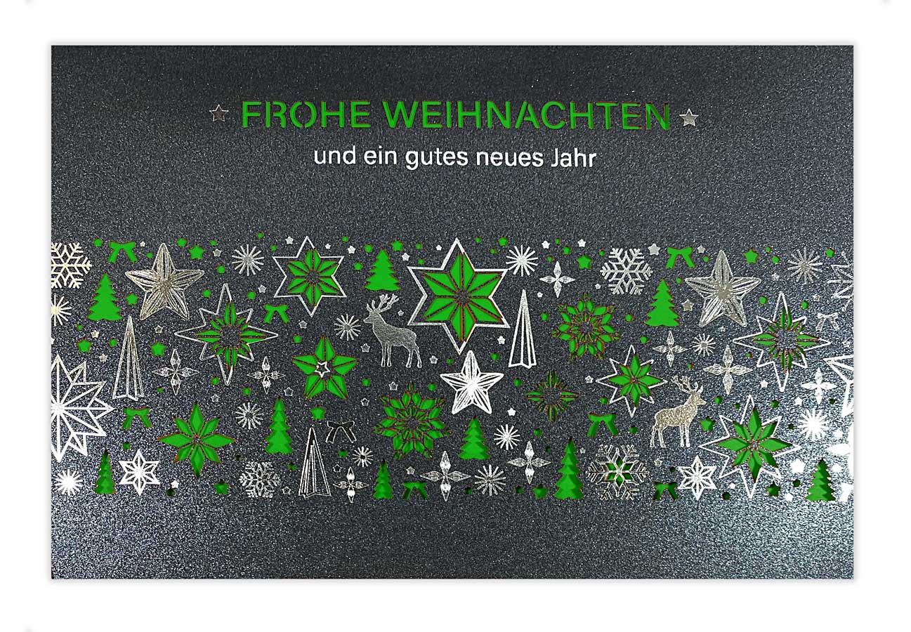 Sterne, Hirsche, Tannenbäume und der Gruß sind in silberner Folienprägung gedruckt und gelasert.