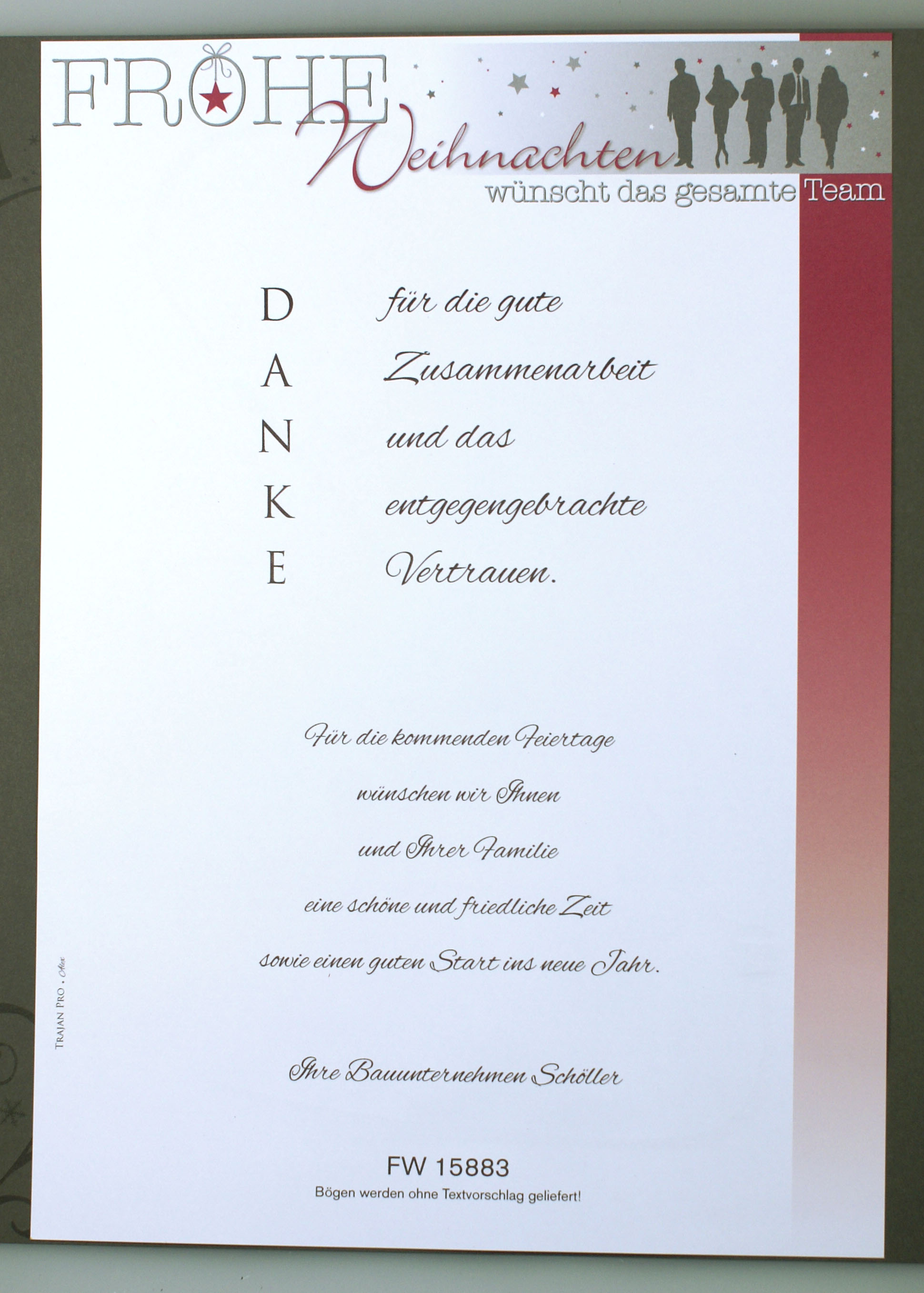 Weihnachtsbrief aus hochwertigem, weißem Briefpapier mit Farbdruck Frohe Weihnachten wünscht das gesamte Team. Der untere Text ist nur ein Beispiel und ist nicht vorgedurckt.