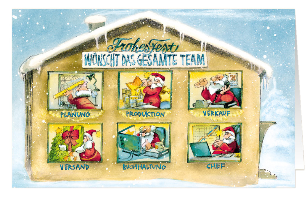 Weihnachtskarte - originelle Branchenkarte für Firmen mit mehreren Abteilungen wie Planung, Produktion, Verkauf, Versand, Buchhaltung, etc.. Aus hochwertigem Chromo-Karton mit Farbdruck.