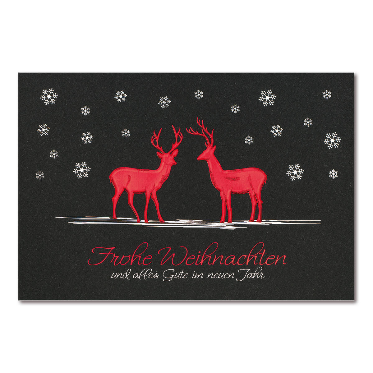 Auf der Karte sind zwei Rentiere geprägt. Silberne Schneeflocken sind ebenfalls geprägt. Am unteren Kartenrand steht: Frohe Weihnachten und alles Gute im neuen Jahr.
