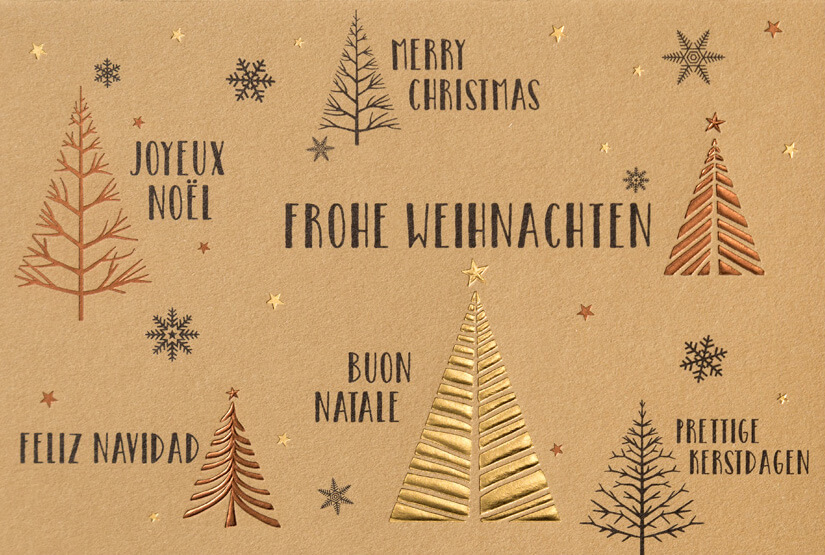 Der Schriftzug Frohe Weihnachten steht in verschiedenen Sprachen gedruckt auf der Karte. Sterne und Weihnachtsbäume sind teilweise in schwarz gedruckt oder mit bronzefarbener bzw. goldener Folie geprägt. Ein cremefarbener Falteinleger liegt bei.