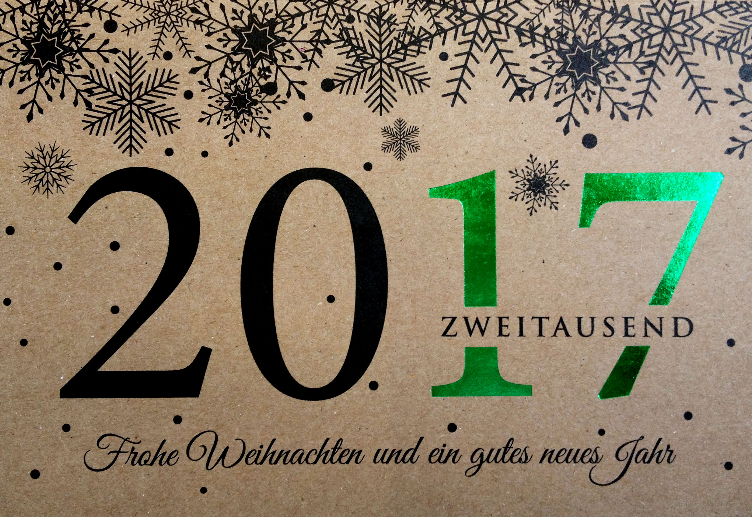 Weihnachtskarte aus hochwertigem braunem Recycling-Kraft-Karton mit Farbdruck und Folienprägung. Auf der Karte steht Frohe Weihnachten und ein gutes neues Jahr. Die große Jahreszahl 2017 ist zur Hälfte in Schwarz gedruckt, die 17 ist mit grüner Metallfolie geprägt.