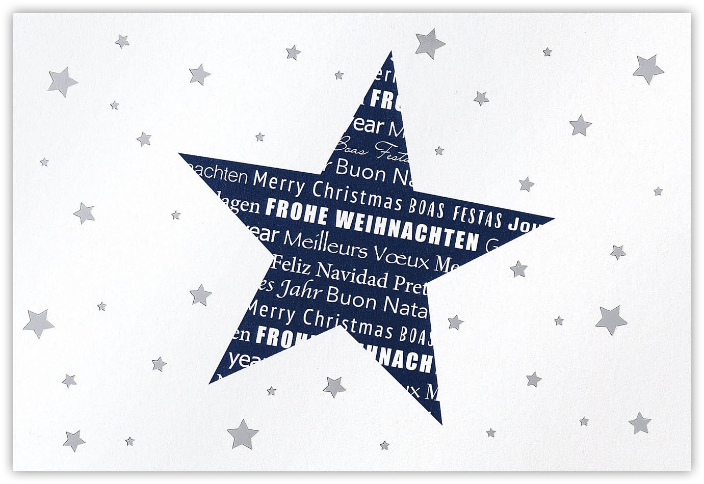 Ein dunkelblauer Stern ist mit internationalen Weihnachtsgrüßen bedruckt. Zahlreiche Sterne sind mit silberner Folie geprägt.