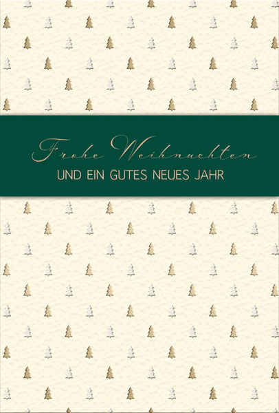 Auf dieser Weihnachtsgrußkarte ist der Schriftzug Frohe Weihnachten abgebildet, darüber sind Weihnachtsbäume zu sehen.