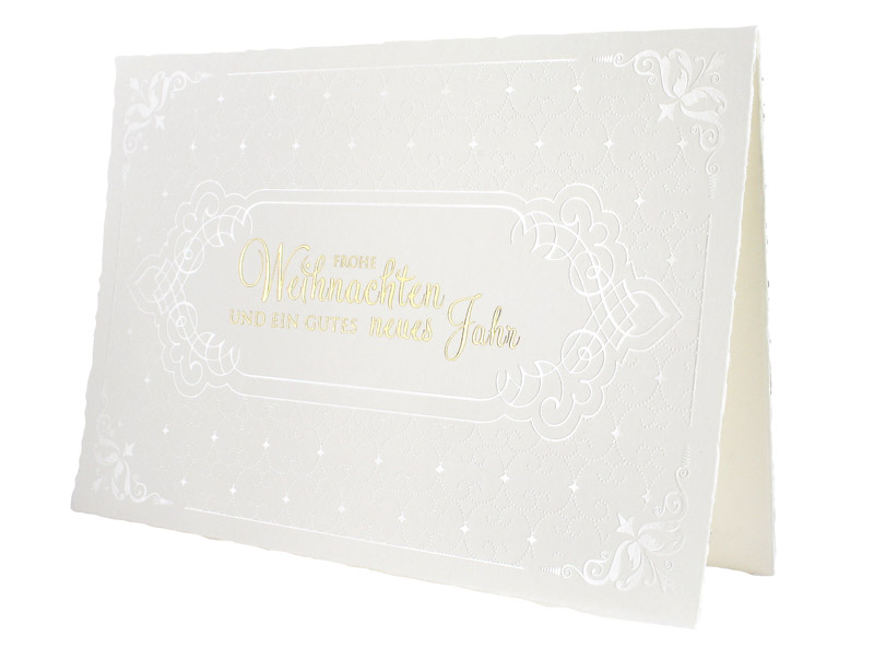 Weihnachtskarte aus hochwertigem, weißem Design-Karton mit Büttenrand und transparenter und goldener Folienprägung.
