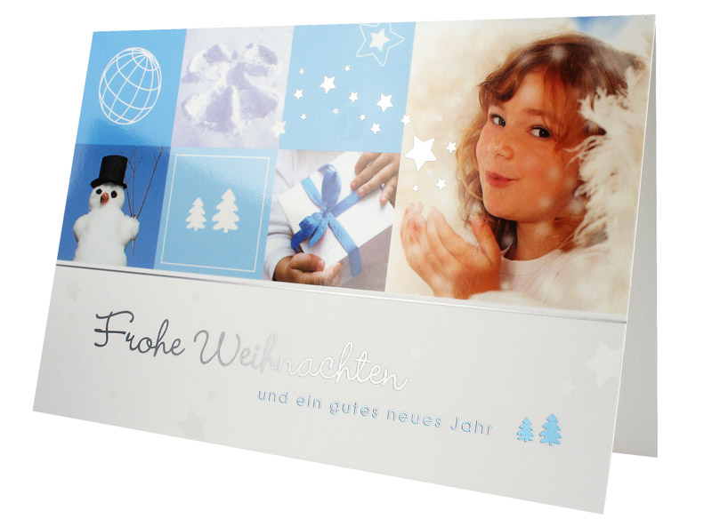 Weihnachtskarte aus hochwertigem, weißem Bilderdruck-Karton mit Farbdruck, silberfarbenem und blauem Metallic-Druck und parteilem Glanzlack.