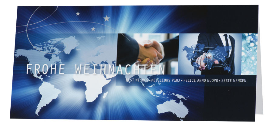 Weihnachtskarte aus hochwertigem weißem Bilderdruck-Karton mit Farbdruck und Glanzlack.Frohe Weihnachten steht in verschiedenen Sprachen auf der Karte. Ein geschäftliche Händedruck und eine Weltkarte sind abgebildet.