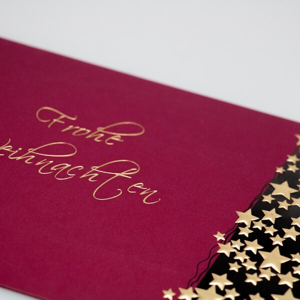 In goldener Folienprägung ist der Gruß "Frohe Weihnachten" mit Sternen und einem Weihnachtsbaum auf die Vorderseite gedruckt.