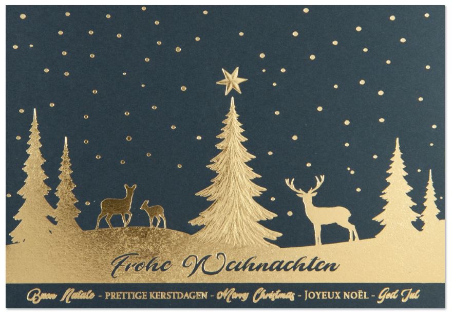 Weihnachtskarte in dunkelblau mit silbernen Hirschen, Eiskristallen und Bäumen