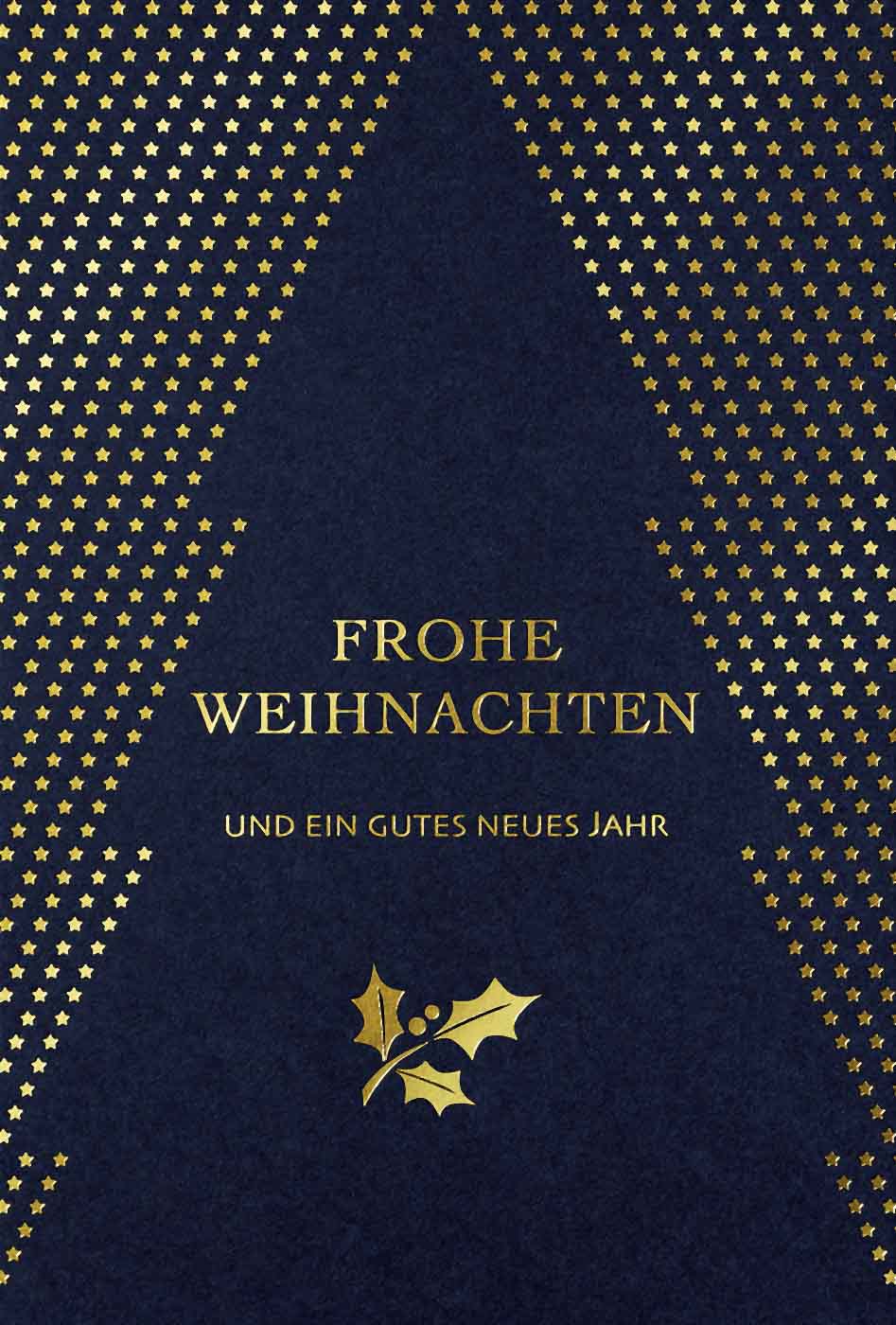Weihnachtskarte aus dunkelblauem Soft-Touch-Karton mit Farbdruck und Goldfolienprägung.