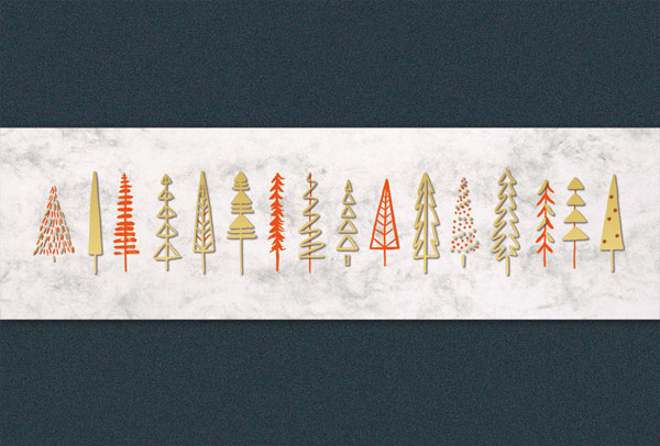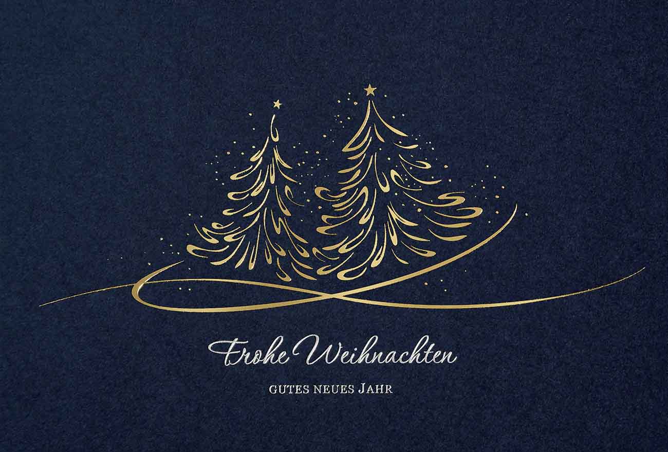 Weihnachtskarte in dunkelblau mit Weihnachtsbäumen und Goldfolienprägung