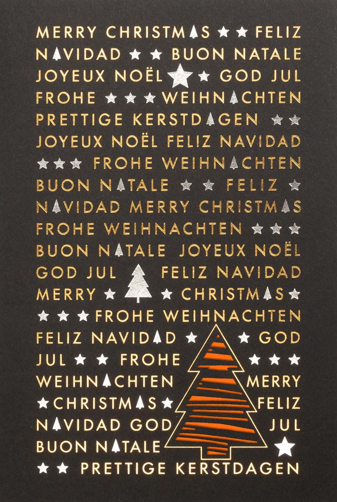 Der Weihnachtsgruß "Ein frohes Fest und ein gutes neues Jahr" ist mittig auf die schwarzgraue Vorderseite gedruckt.