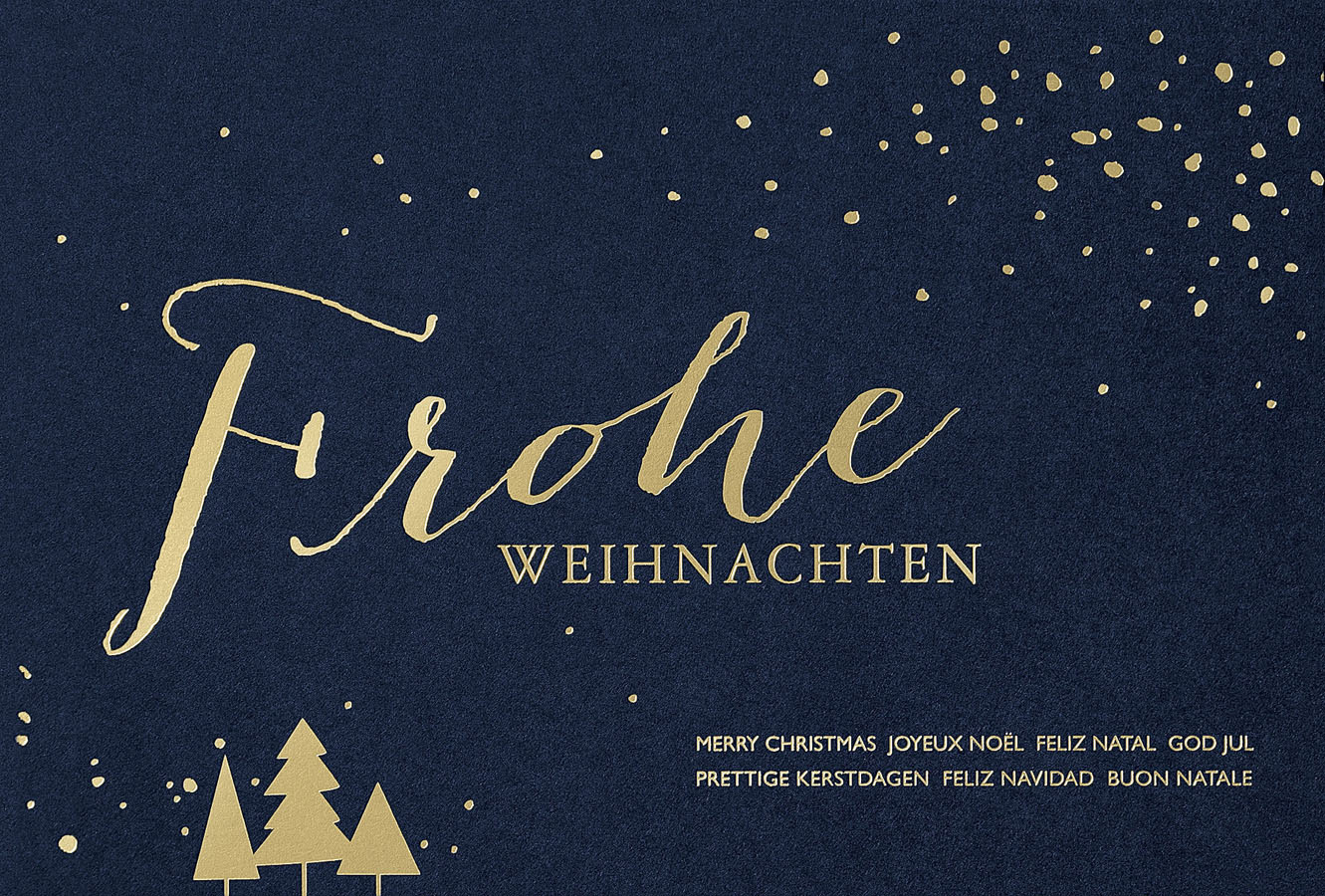 Weihnachtskarte nachtblau mit goldener Folienprägung Frohe Weihnachten international
