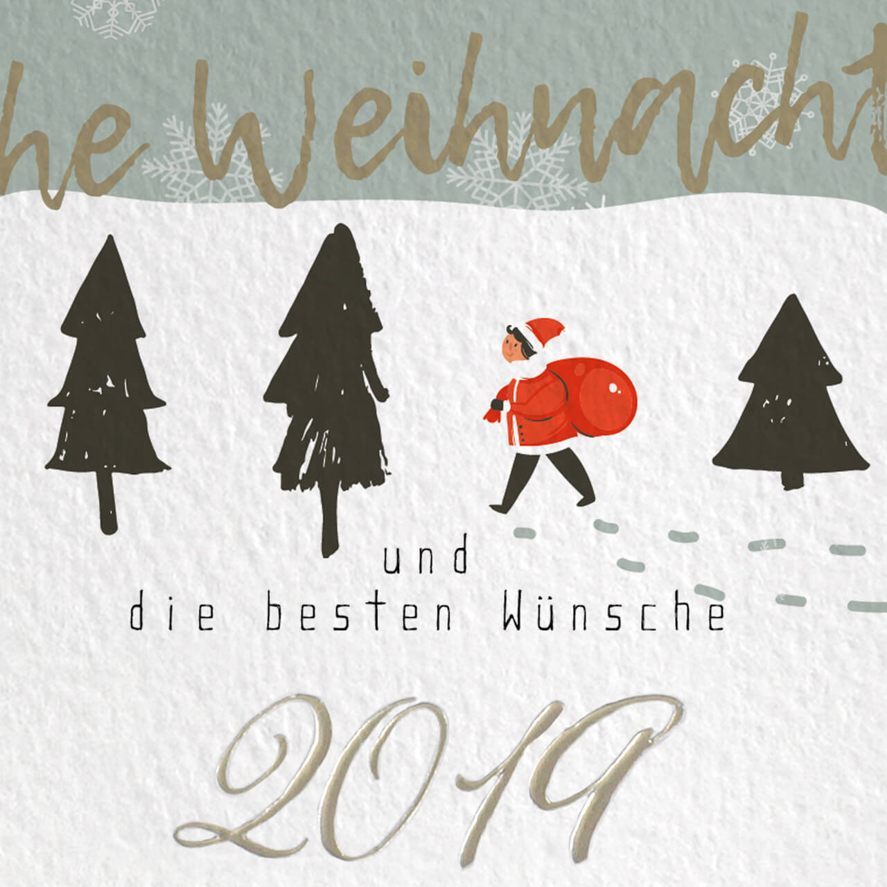 Diese Weihnachtskarte ist aus hochwertigem Aquarellkarton mit leichter Oberflächenstruktur angefertigt. Auf der Vorderseite der Klappkarte ist eine graugrüne Fläche mit weißen Schneekristallen und verspielter Zeichnung eines Weihnachtsmann zwischen gezeichnetten Weihnachtsbäumen zu sehen. Die 2019 ist in Perlmut-Relief-Folienprägung aufgebracht.