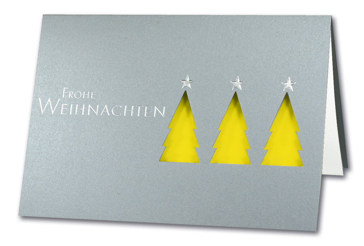 Weihnachtskarte aus silbernem Metallic-Karton mit Silberfolienprägung "Frohe Weihnachten" und Stanzung von drei Tannenäumen mit Stern. Bei dieser Stanzkarte können Sie aus verschiedenen farbigen Einlegeblättern auswählen.