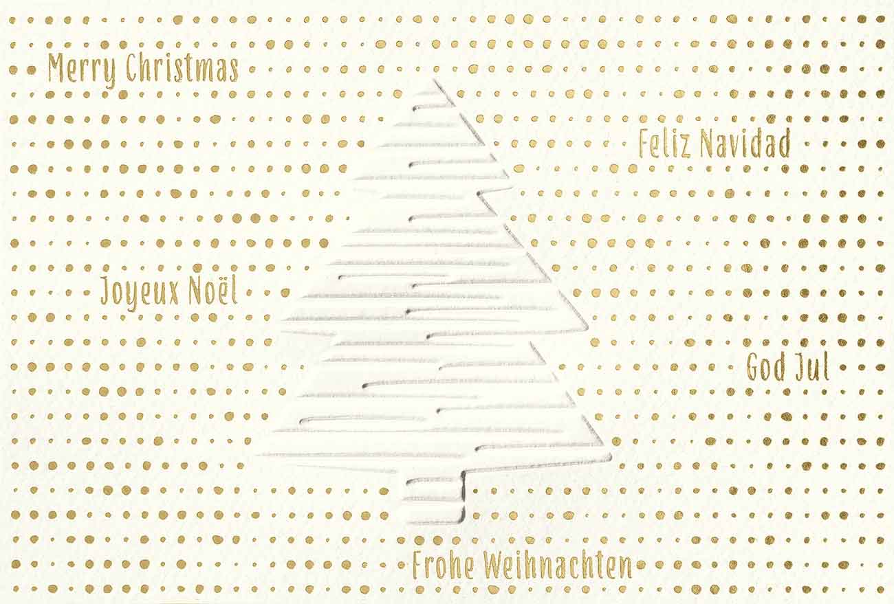 In silberner und goldener Folienprägung sind internationale Weihnachtsgrüße auf die Karte geprägt.