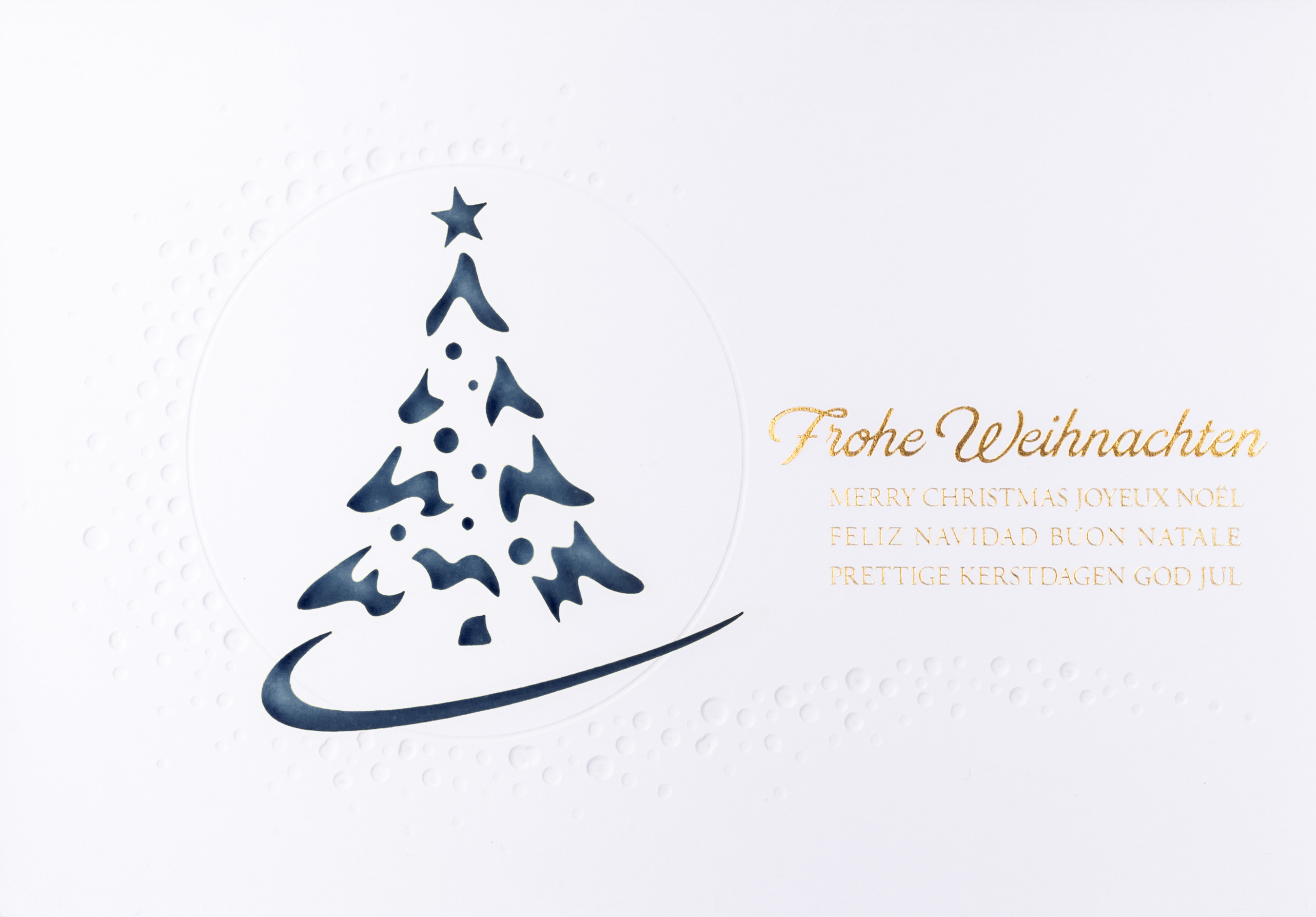 Internationale Weihnachtskarte mit Laserstanzung Baum in weiß mit dunkelblauem Einlegeblatt und goldener Folienprägung. Das Einlegeblatt der Laserkarte ist noch in vielen weiteren Farben erhältlich.Wählen Sie zwischen den Farben dunkelblau, dunkelgrün, dunkelrot, blau, grün, rot, kupfer, orange und pink (magenta). Laser-Weihnachtskarte aus weißem Designkarton mit weißem Haftklebe-Kuvert.Ein gelaserter Tannenbaum zeigt das blaue Einlegeblatt im Inneren der Grußkarte. Daneben stehen in gold mehrsprachige Weihnachtsgrüße. In fühlbarem Reliefdruck sind rund um den Baum herum kleine Pünktchen geprägt.Nur die Vorderseite des Einlegeblattes ist dunkelblau, die Innenseiten sind weiß und können individuell mit Weihnachtsgrüßen, Firmenlogo und / oder Unterschriften bedruckt werden.Die Einleger werden lose, plano, nicht in die Weihnachtskarten eingelegt geliefert.Die Karte wird nach oben aufgeklappt. Wenn wir die Weihnachtskarten auf der Innenseite des Einlegeblattes bedrucken sollen, müssten Sie die Option "Profi gestalten lassen" oder "Jetzt selbst gestalten" auswählen. Klappkarte im Format: 17 x 11,5 cm Breite x Höhe (17 x 23 cm aufgeklappt). Der Kartenpreis ist inklusive weißem Brief-Kuvert mit Haftklebung. Farbe (vorne / innen) weiß, dunkelblau / dunkelblau, weiß Format:  Klappkarte 17 x 11,5 cm Breite x Höhe (aufgeklappt:17 x 23 cm) Papier:  Karte: Designkarton weiß, Einleger: dunkelblau / weiß Kuvert / Briefumschlag:  Ja, inklusive Porto:  kann als Standardbrief versendet werden, mehr Infos Lieferumfang:  Klappkarte, Briefumschlag, Einlegeblatt Preis:  Preis inkl. MwSt., zzgl. Versandkosten
