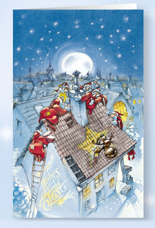 Mit dieser Branchen-Weihnachtskarte drücken Sie die Leidenschaft an Ihrem Beruf aus. In detailreichen, farbenfrohen Bildern ist diese Klappkarte passend für Zimmereien und Dachdeckerbetriebe.