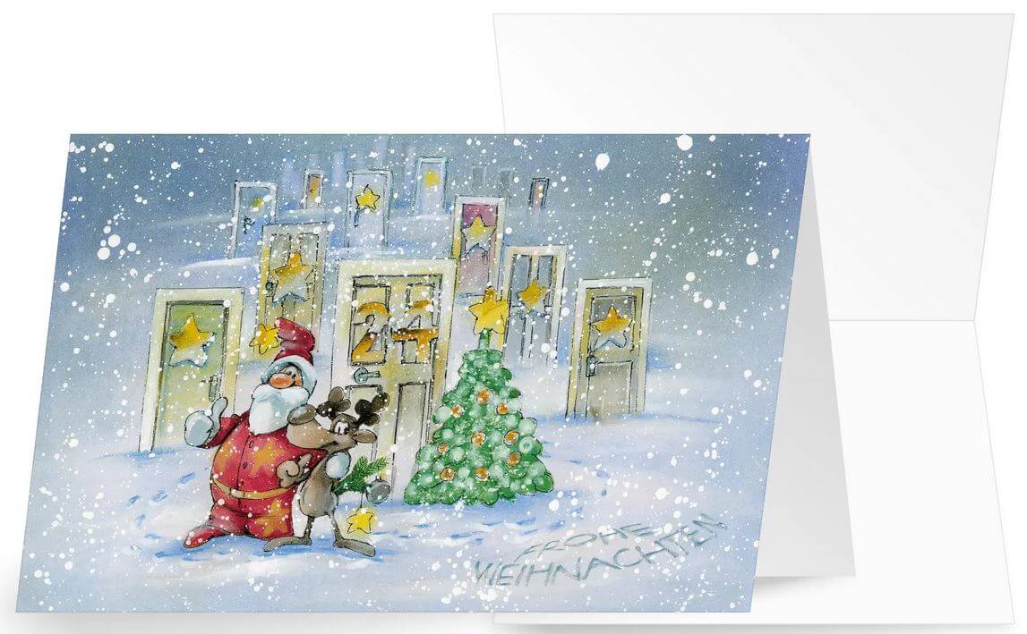 Branchen-Weihnachtskarte im lustigen Design mit verschiedenen Türen, dem Weihnachtsmann und seinem Rentier. Weihnachtskarte aus klimaneutralem Bilderdruckkarton mit buntem Farbdruck.Der Weihnachtsmann möchte sich eine neue Tür kaufen und kann sich bei der schönen Auswahl im Türenstudio nicht entscheiden. Das Rentier steht ihm unterstützend zur Seite.Gerne bedrucken wir Ihnen die Weihnachtskarte innen mit individuellen Weihnachtsgrüßen, Firmenlogo oder Unterschriften.Die Karte wird nach oben aufgeklappt. Wenn wir die Karte auf der Innenseite mit Ihrem Weihnachtsgruß-Text, Firmenlogo oder Unterschriften bedrucken sollen, müssten Sie die Option "Profi gestalten lassen" oder "Jetzt selbst gestalten" auswählen. Ebenso können wir auf die Briefumschläge Ihre Absenderadresse oder den Empfänger aufdrucken. Klappkarte im Format 19x12 cm Breite x Höhe (aufgeklappt: 19x24 cm cm Breite x Höhe).Der Karton dieser Karte ist klimaneutral nach dem Modell "ClimatePartner" gefertigt und leistet damit einen aktiven Beitrag zum Umweltschutz.Der Kartenpreis ist inklusive Briefumschlag, es wird automatisch ein weißes Briefkuvert mitgeliefert. Sie haben Fragen zum Bedrucken der Karte? Gerne können Sie telefonisch oder per e-Mail Kontakt zu uns aufnehmen. Wir helfen Ihnen weiter und beraten Sie bei Unklarheiten. Durch unsere langjährige Erfahrung können wir Ihre Wünsche umsetzen und Sie werden viel Freude an der fertig bedruckten Weihnachtskarte haben.      Farbe (vorne / innen) bunt / weiß Format:  Klappkarte 19 x 12 cm Breite x Höhe (aufgeklappt: 19 x 24 cm) Papier:  Bilderdruckkarton 250g weiß Kuvert / Briefumschlag:  Ja, inklusive, weiß Porto:  kann als Standardbrief versendet werden, mehr Infos Lieferumfang:  Klappkarte, Briefumschlag Preis:  Preis inkl. MwSt., zzgl. Versandkosten