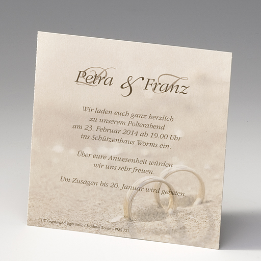 2 Stück Hochzeits-Zusatzeinladungskarten oder Save the Date Karte aus crème Metallickarton mit Motivdruck Trauringe im Sand-Strand.